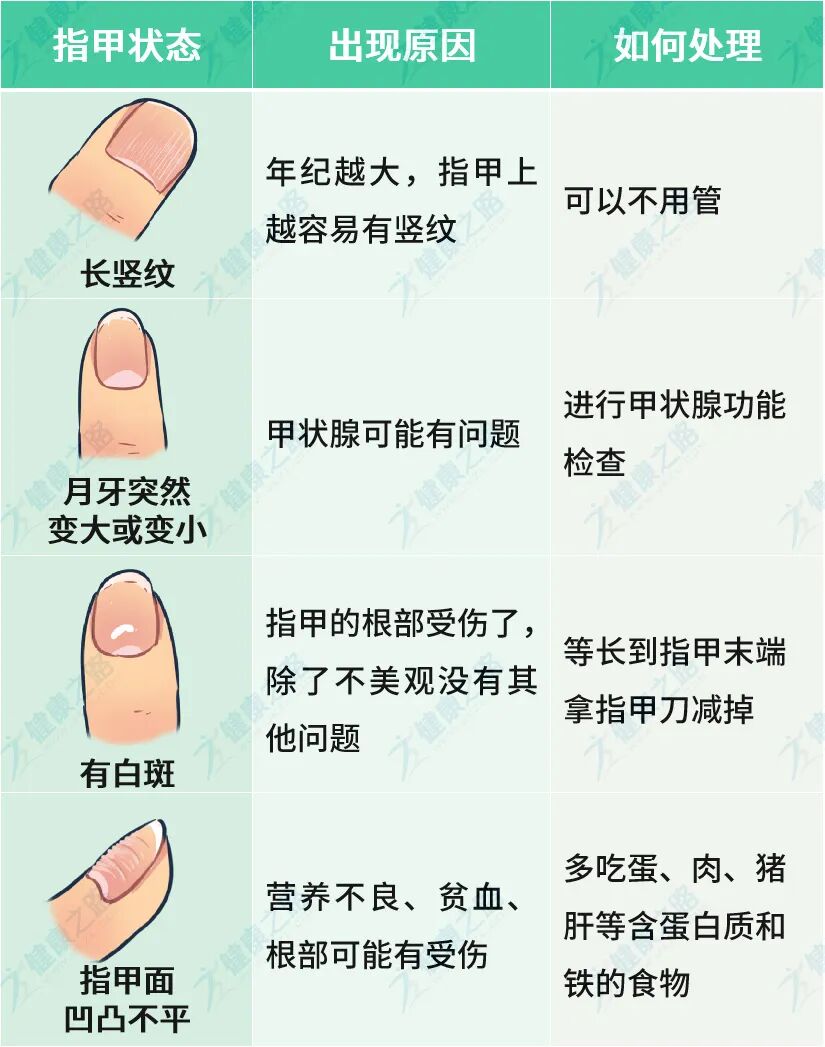 所以,发现指甲出现了这些异常情况,要立刻去医院,详细做个检查排除病因。