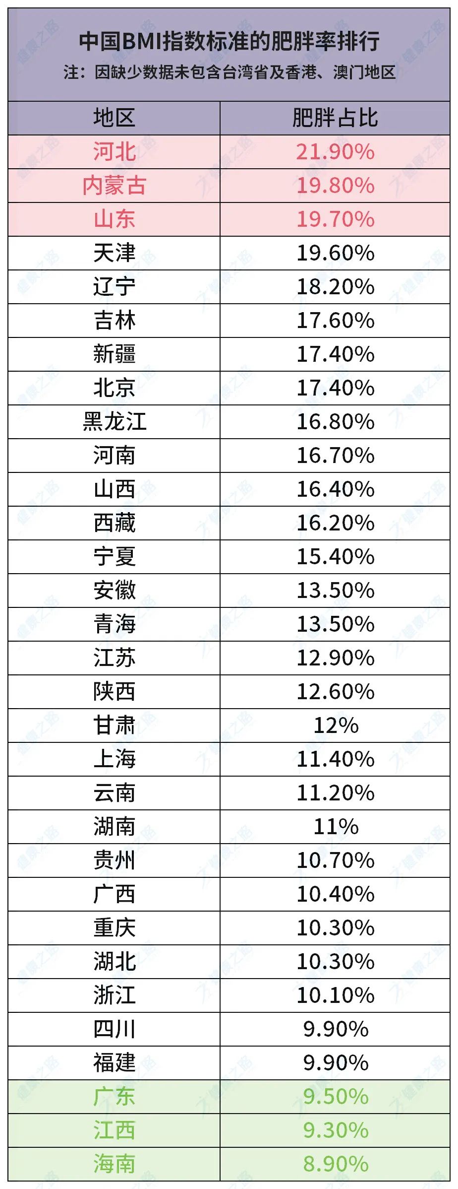 从图上可知,肥胖率排名前三的分别是河北、内蒙古、山东,而在末尾的则是广东、江西、海南。