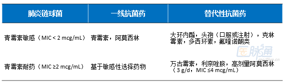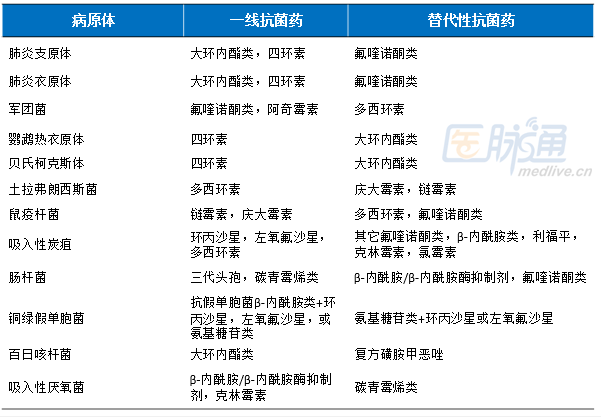 下表是对引起细菌性肺炎特定病原体的一线和二线抗菌药物。
