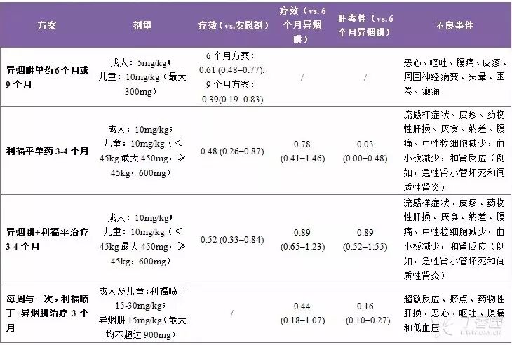 表2.潜伏性结核感染预防治疗常用方案的疗效和不良反应