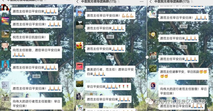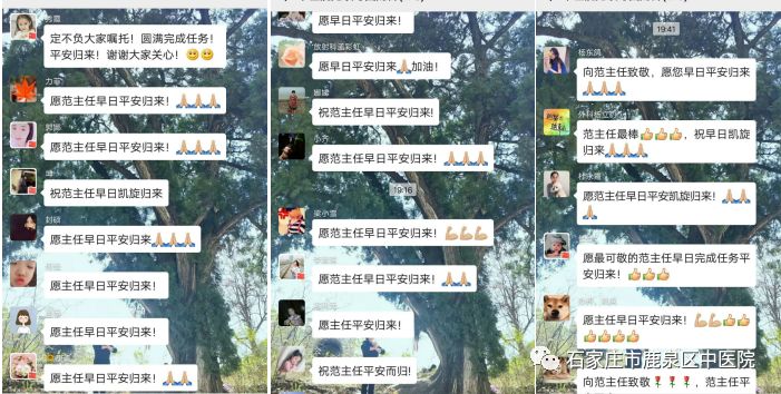 鹿泉区中医院全院职工,听说心内科范主任要去驰援武汉,纷纷通过打电话、发微信等不同方式为她送行,叮嘱她一定要平安归来,全体医护人员表示,已经做好准备,随时听从党和祖国的召唤,同武汉人民一道坚决打赢这场新冠肺炎阻击战!